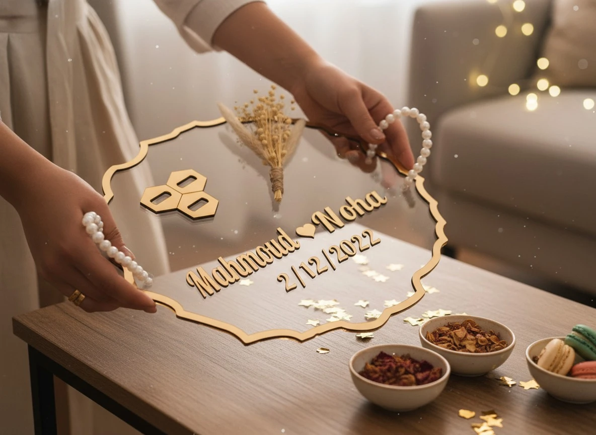 لوحة احتفالية فاخرة مصنوعة من الأكريليك الشفاف مع حواف ذهبية أنيقة، تحمل أسماء العروسين مع التاريخ بتصميم ثلاثي الأبعاد مميز.