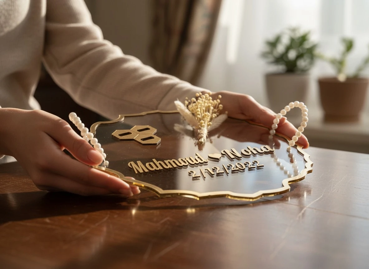 لوحة احتفالية فاخرة مصنوعة من الأكريليك الشفاف مع حواف ذهبية أنيقة، تحمل أسماء العروسين مع التاريخ بتصميم ثلاثي الأبعاد مميز.