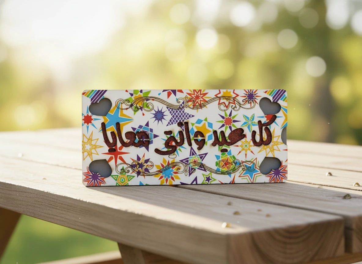 لوحة زينة خشبية بتصميم ملون ومبهج، مثالية لتزيين المنزل أو المكتب في المناسبات والأعياد.